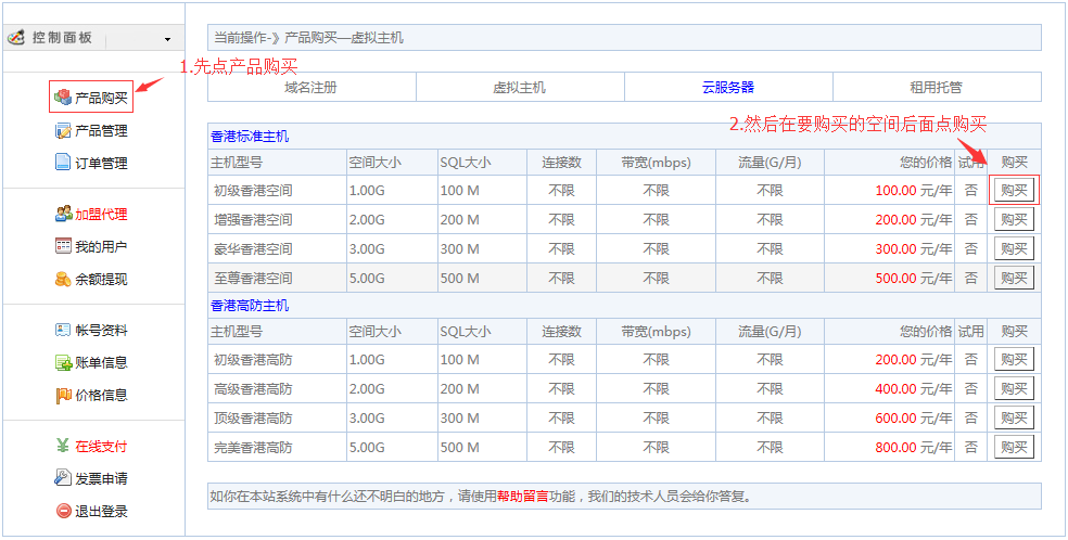 一、虚拟主机购买方法: