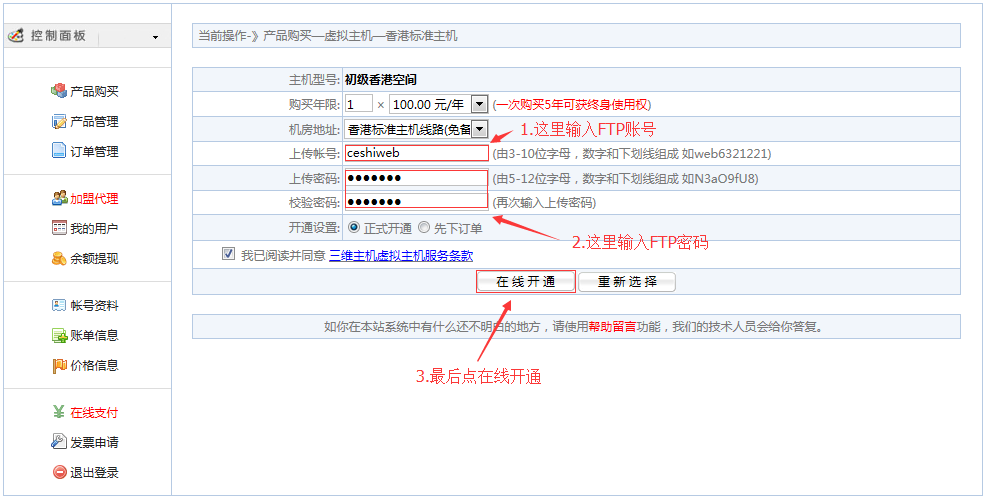 登陆之后,如果您有网银或支付宝,可以点左边的“在线支付”功能充值,如果没有网银和支付宝,也可以通过银行汇款,我们确认汇款之后,可以给您入账,之后您可以点产品购买,根据提示即可开通空间,非常简单!